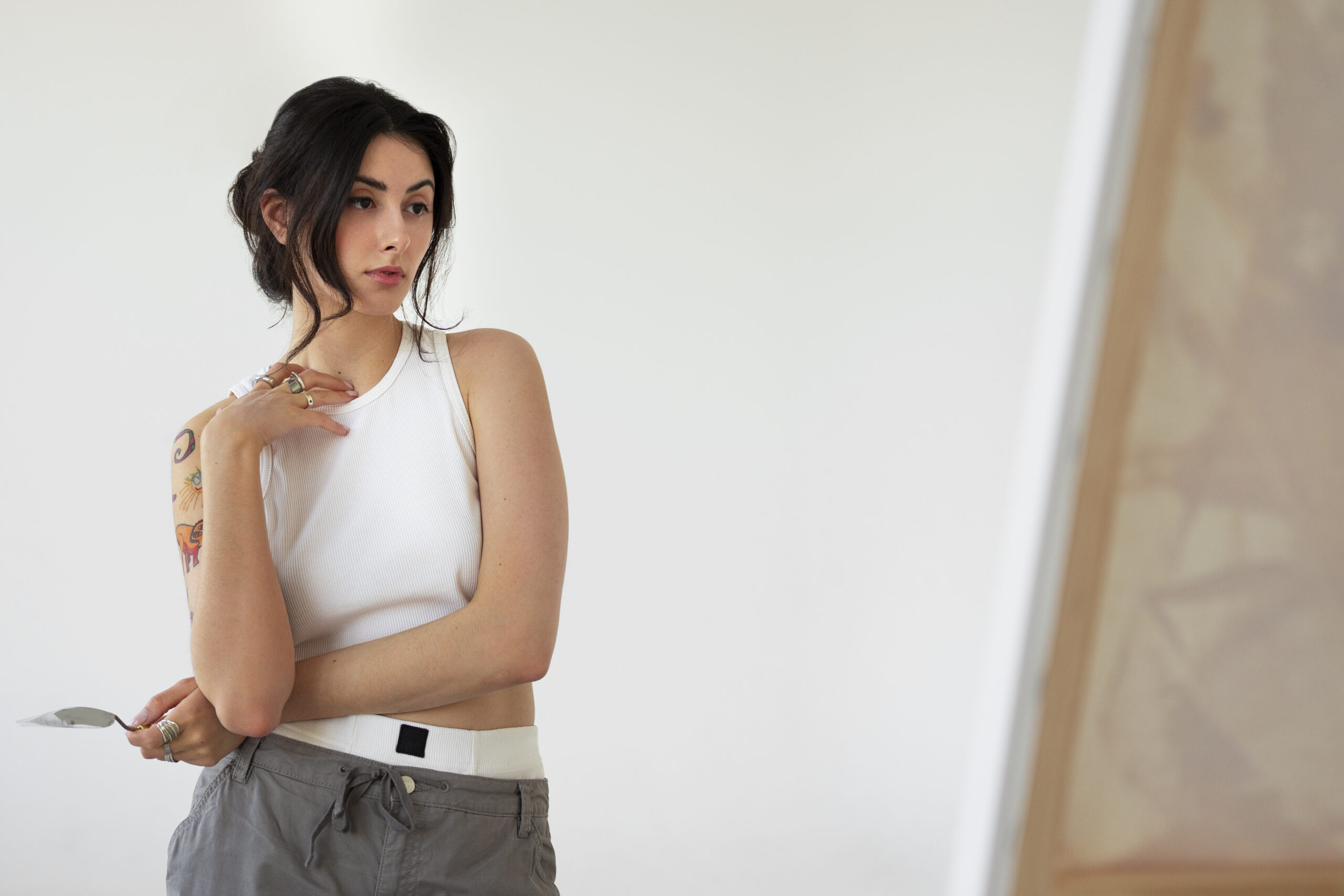 A young woman stands thoughtfully in front of a canvas while holding a painting tool. She wears a white tank top, neutral-toned pants, and has visible tattoos on her arm. The bright, minimal background creates a calm, reflective atmosphere, emphasizing contemplation and creativity.